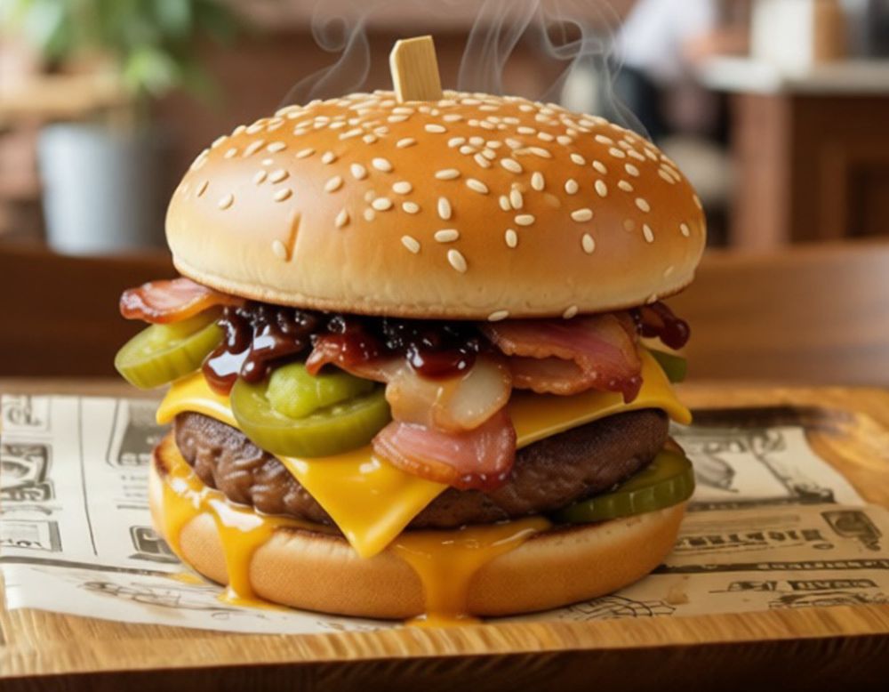 Булочка, котлета «Говядина со свининой», бекон жареный, сыр "Чеддер", перец "Халапеньо" , помидоры свежие, огурцы маринованные, лук маринованный, соуc "1000 островов" , соус "Горчичный -Барбекю".