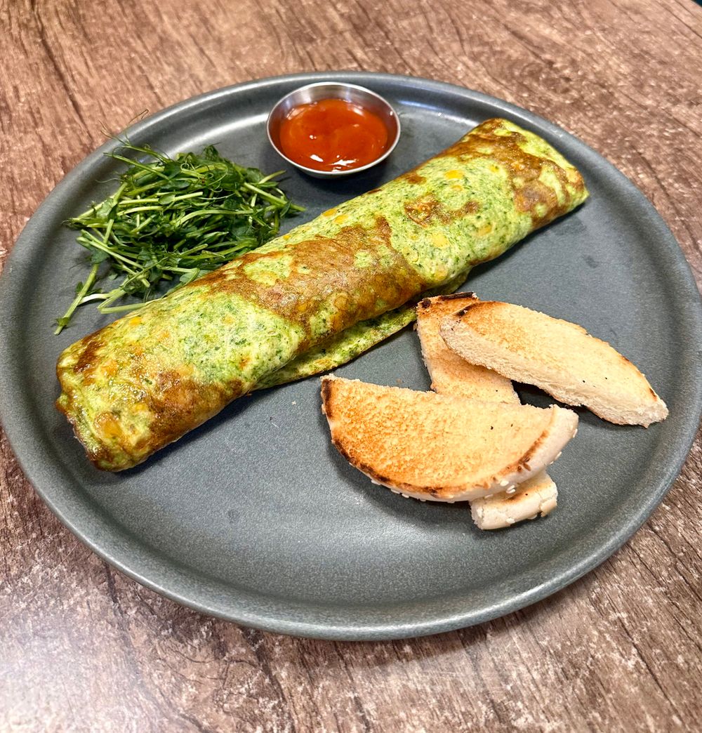 Яйцо,шпинат, кукуруза и сыр, творожный сыр, соус «Сальсо», тост, зелень