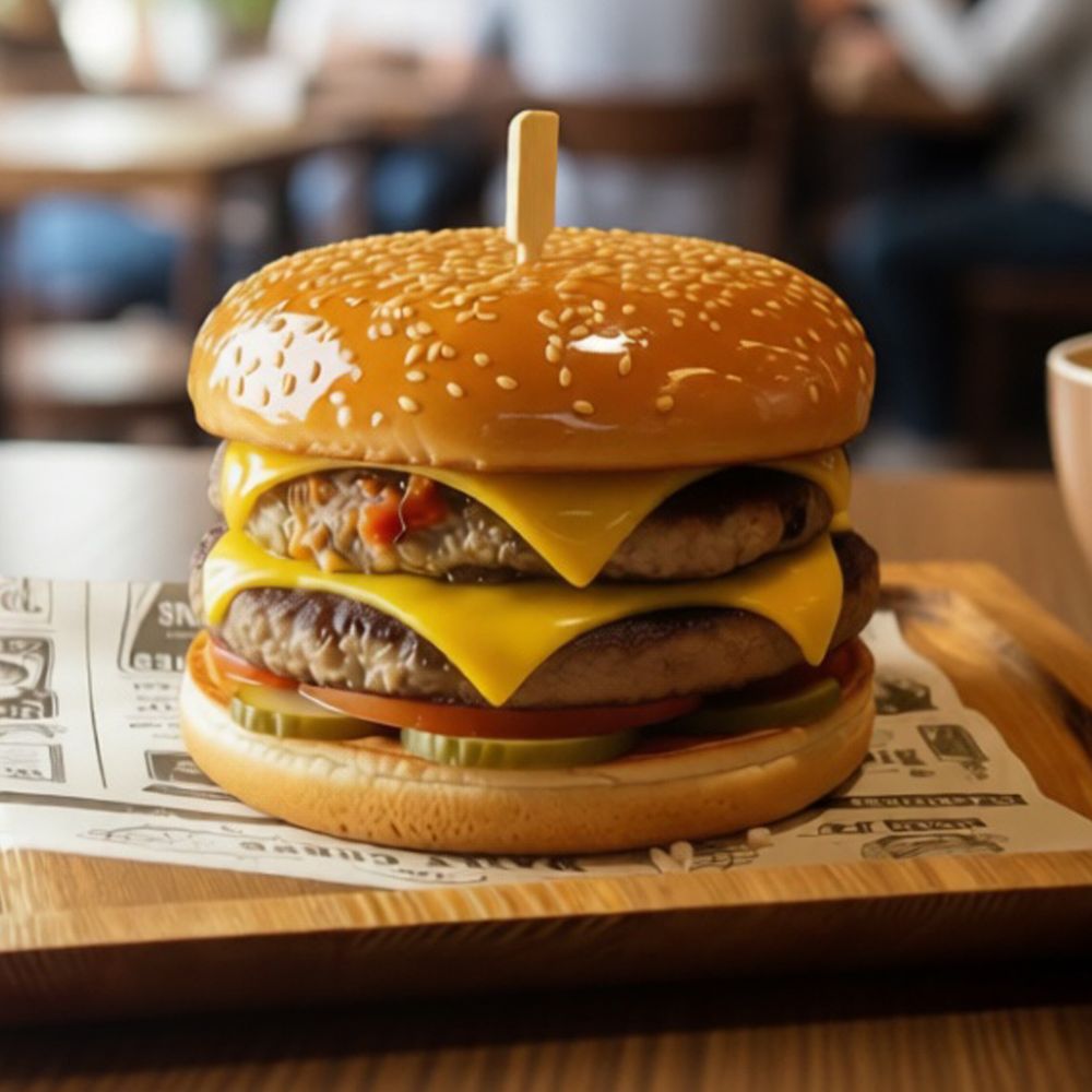 Булочка, котлета «Говядина со свининой» 2 шт, сыр "Чеддер" , помидоры свежие, огурцы маринованные, лук маринованный, соуc "Томатный"
