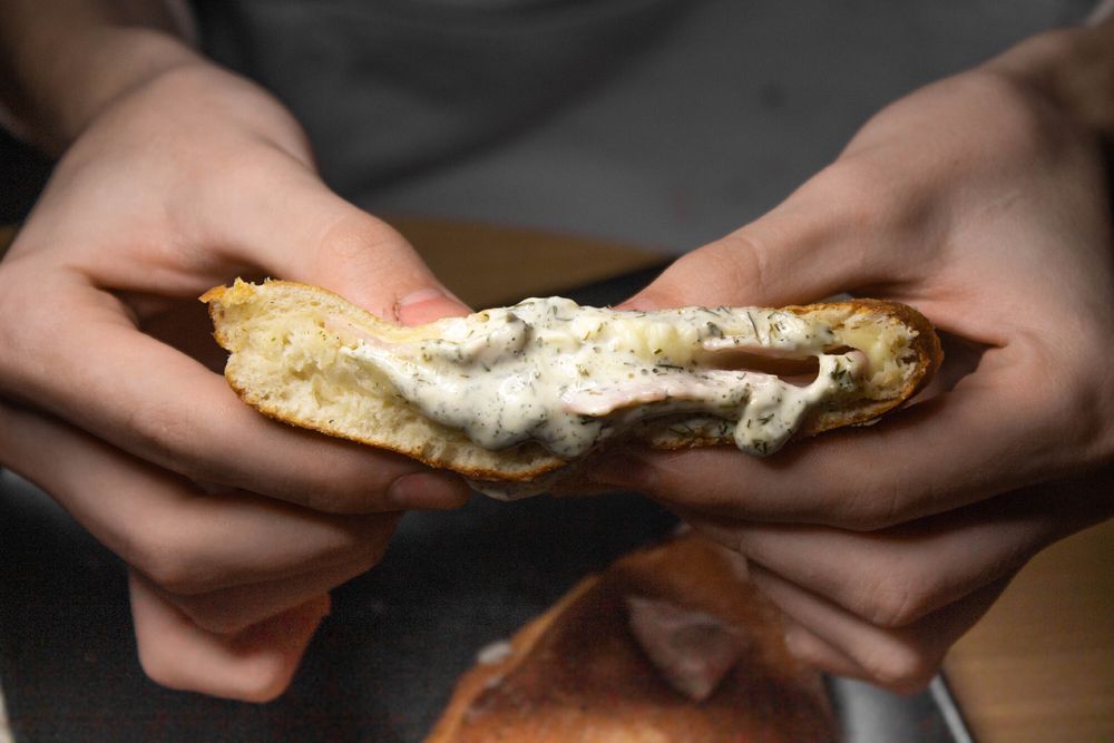 Сыр Моцарелла, курица запеченная в специях, соус "Ранч"