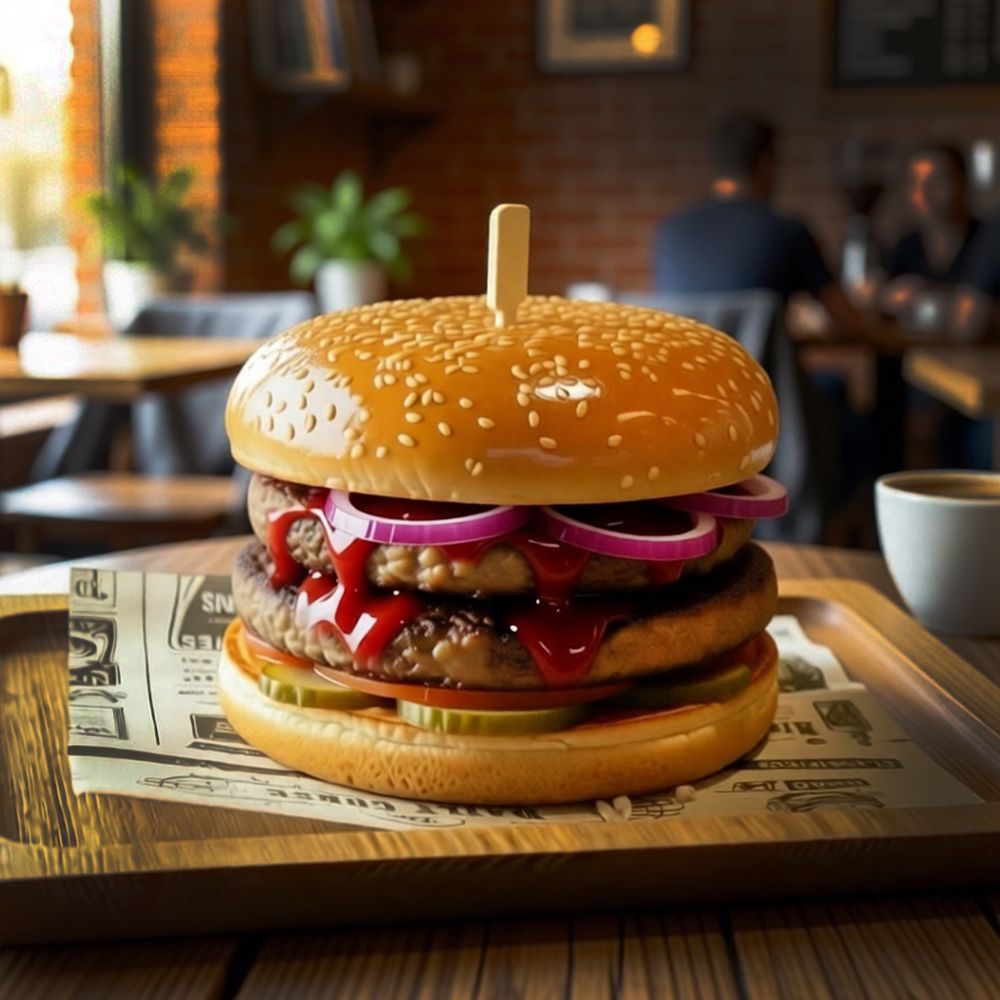 Булочка, котлета «Говядина со свининой» 2 шт, помидоры свежие, огурцы консервированные,лук маринованный, соуc " Томатный "