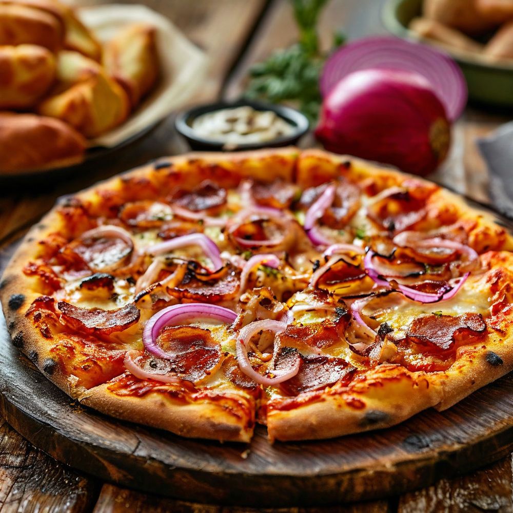 Сыр моцарелла, бекон, ветчина,лук маринованный, фирменный томатный соус