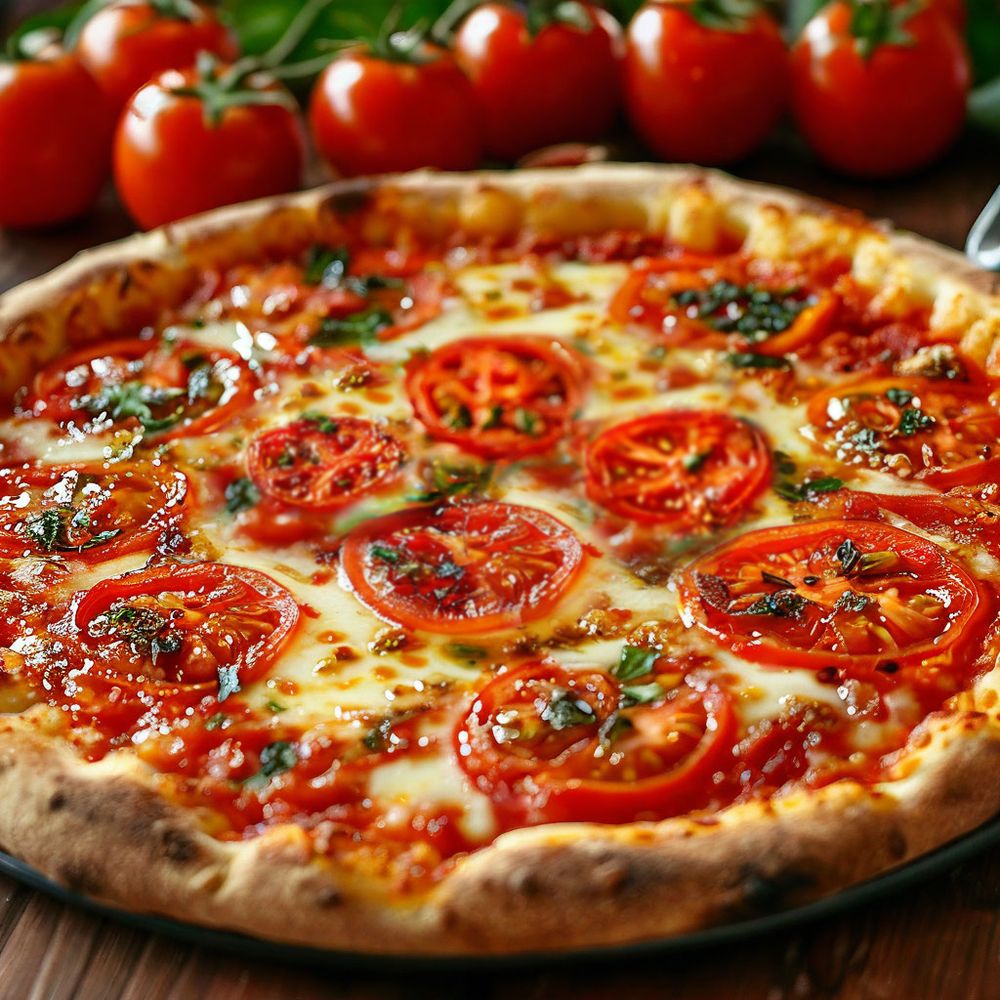 Сыр моцарелла, помидоры, базилик, фирменный томатный соус