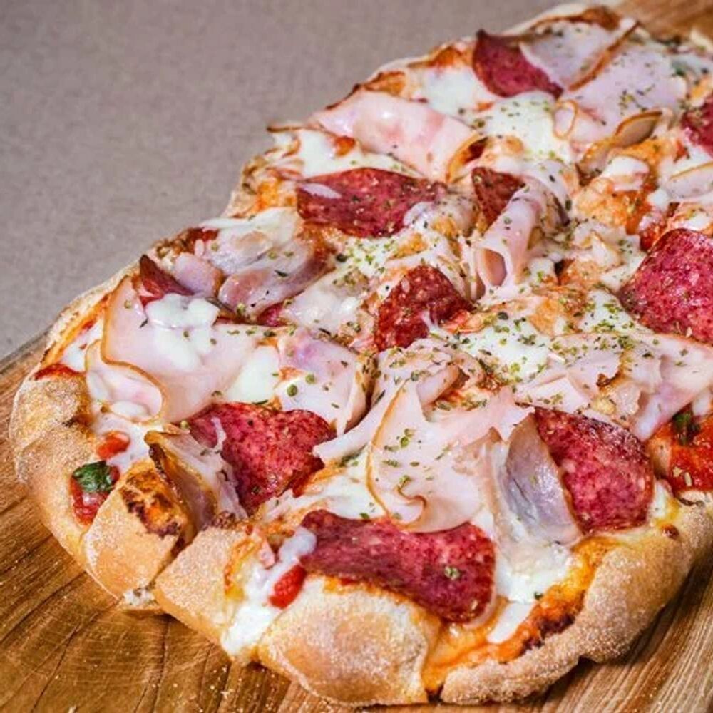 Нежная моцарелла, хрустящий бекон, тонкая ветчина, пряный пепперони и фирменный томатный соус