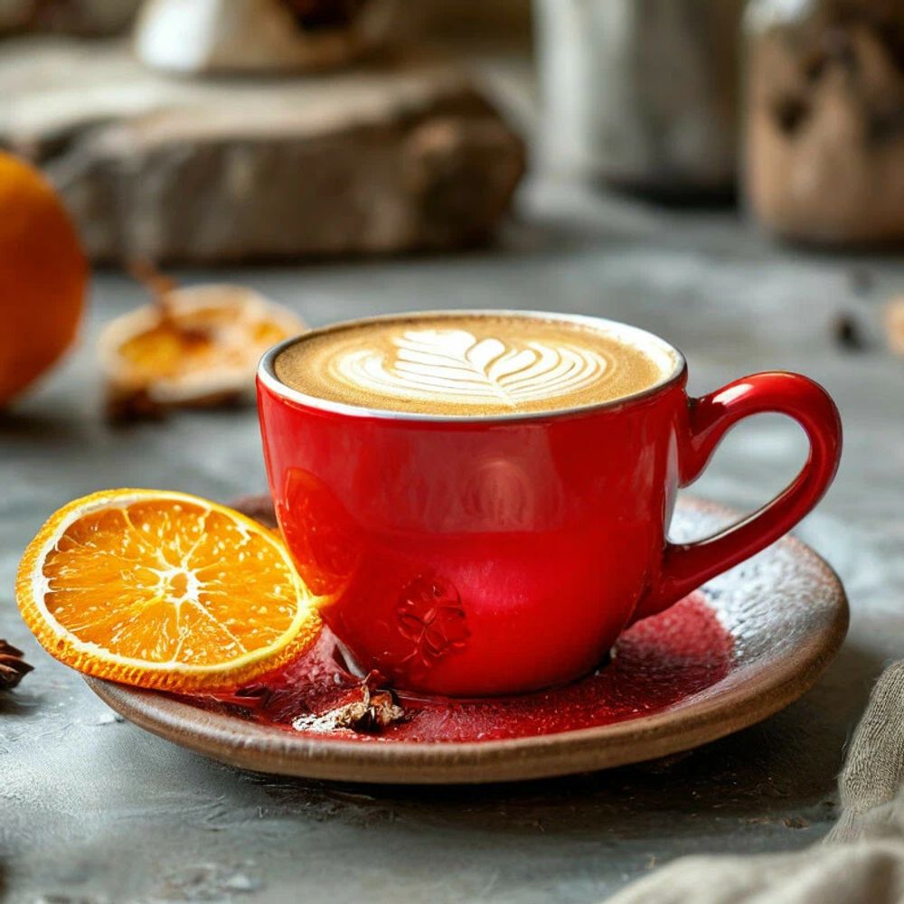 Кофейный напиток из молока и кофе эспрессо с сиропом собственного производства "Цитрусовый", корицей и сушеным мандарином