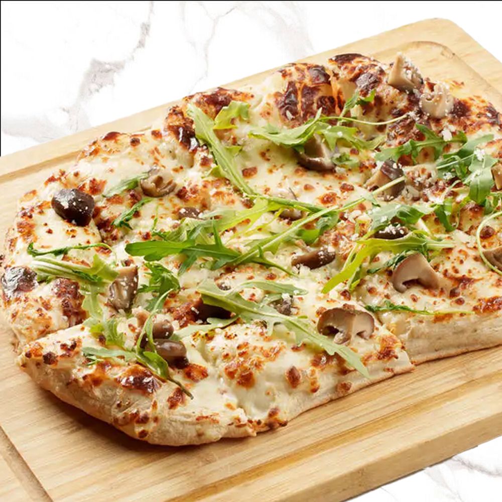 Сливочный соус, моцарелла, грибы шампиньоны с грибным соусом и зелень