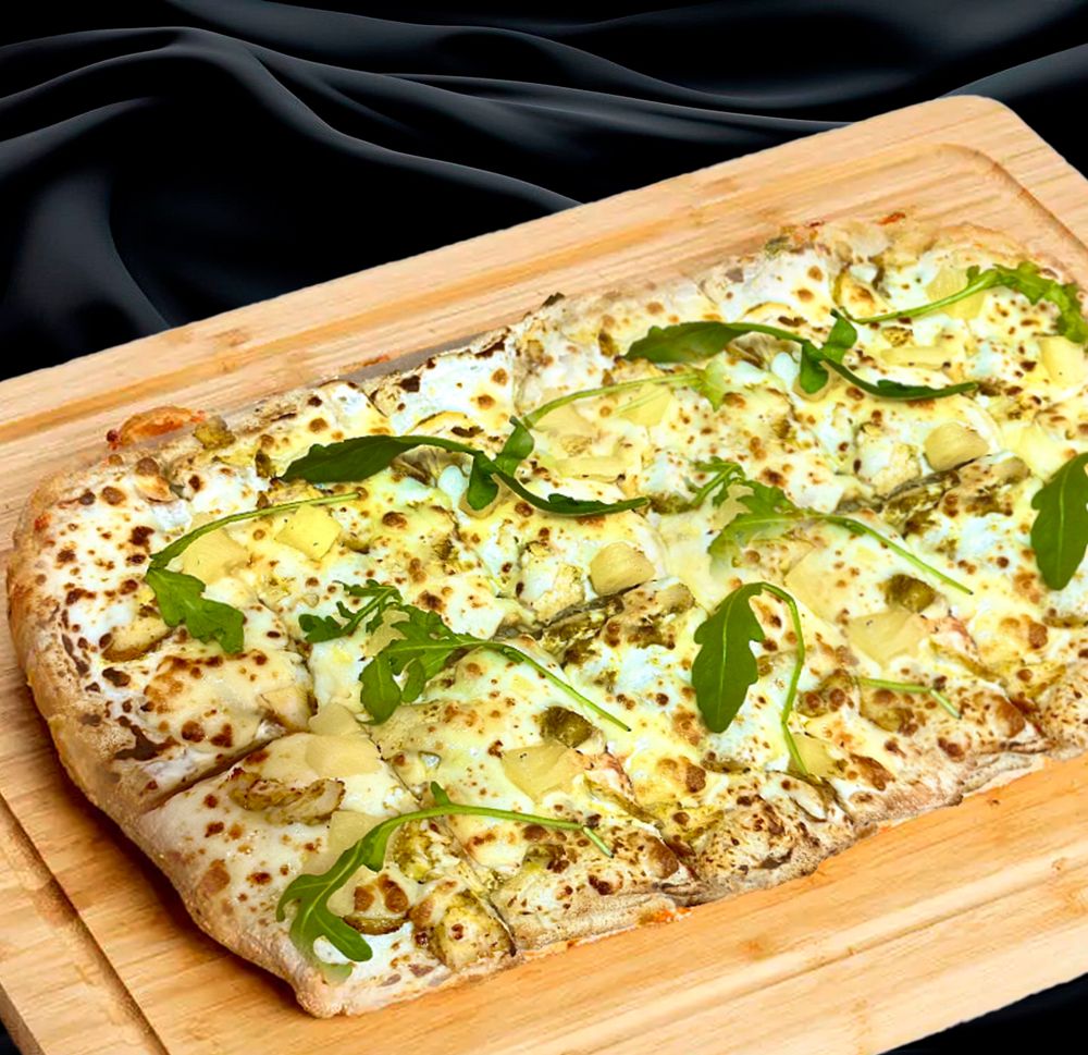 Сливочный соус, сочное куриное филе, тягучая моцарелла, ананасы конс. и зелень