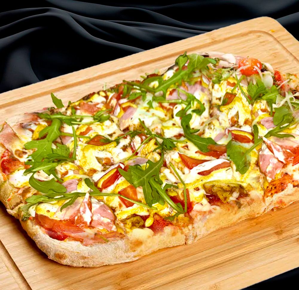 Сливочный соус, сочное куриное филе, ветчина ,тягучая моцарелла, помидоры и зелень , соус Ранч и соус Цезарь